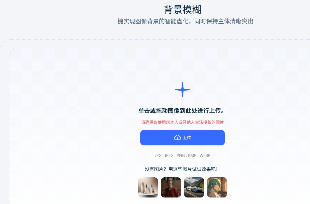 用于上传待模糊背景的照片,支持单击选择和拖拽上传两种方式。
