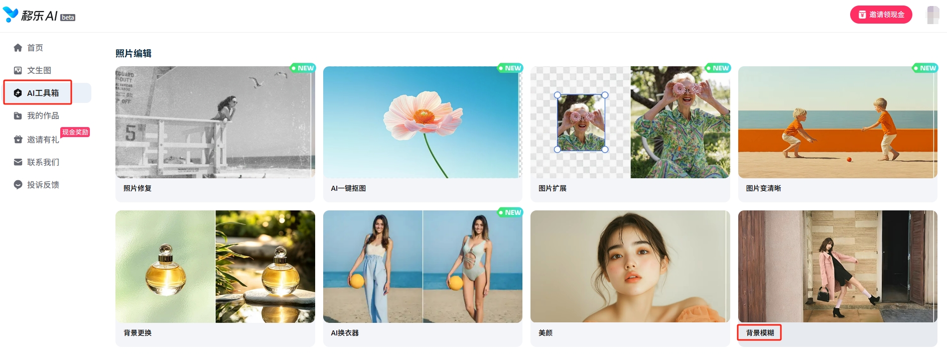 点击左侧“AI工具箱”,或者点击“AI图像处理”旁边的小箭头,找到“移乐AI背景模糊”并点击进入。单击选择和拖拽上传待模糊的图片。