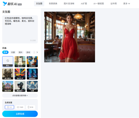 例如,你想生成一张穿红色连衣裙的女生在咖啡厅的场景,这时你输入“红色连衣裙模特+咖啡店场景+写实风+暖色调、柔光、面料纹理清晰”,比单纯输入“红色连衣裙”生成的图像更符合需求。