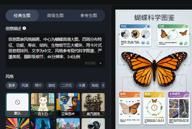 移乐 AI 针对中文语境做了深度优化,语义解析准确率超 92%,大白话描述也能精准还原画面,不用翻译、不用抠专业词汇,比如 “信息图表风格插画,中心为蝴蝶高清大图,四周分布特征、功能、寿命、结构、生物细节五大模块,用卡片式信息框排列,文字为中文,风格参考现代科学图鉴,严谨美观,摄影级细节,4K分辨率,3:4比例”,就能生成符合预期的图片,彻底解决国外工具 “中文理解偏差大” 的问题。