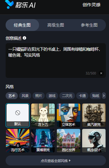 个人用户的需求很简单:朋友圈配图、头像、壁纸、节日贺卡等,追求 “好看、贴合场景、低成本”。移乐 AI 内置70 + 种风格模板,涵盖二次元、写实、国风、赛博朋克、治愈风等,一键选择就能生成符合预期的图片,不用纠结风格、不用调整细节,轻松做出有质感的视觉素材。