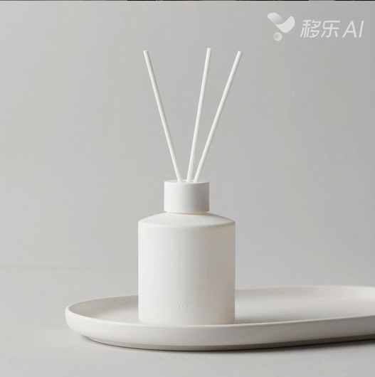 模板3(极简商用海报):极简风,商用级画质,8K高清,一款白色香薰,放在简约托盘上,背景浅灰,柔和自然光,无多余元素,突出产品主体,可直接商用;
