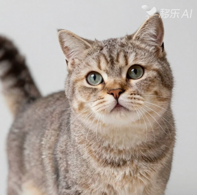 核心技巧+模板:8K高清,写实风格,一只英短猫,毛发浓密,根根分明,绒毛细腻,眼神呆萌,耳朵耷拉,嘴角微扬,背景简约浅灰,突出宠物主体,-模糊,-毛发结块,适配移乐AI高级生图V5.0 Lite;