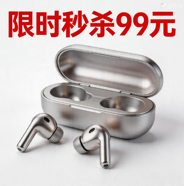 完整模板:商用级画质,8K高清,一款无线耳机,金属材质,自然反光,无划痕,背景纯白色,海报标题“限时秒杀99元”,醒目加粗,红色色彩,促销氛围拉满,可直接商用,适配移乐AI高级生图V5.0 Lite;