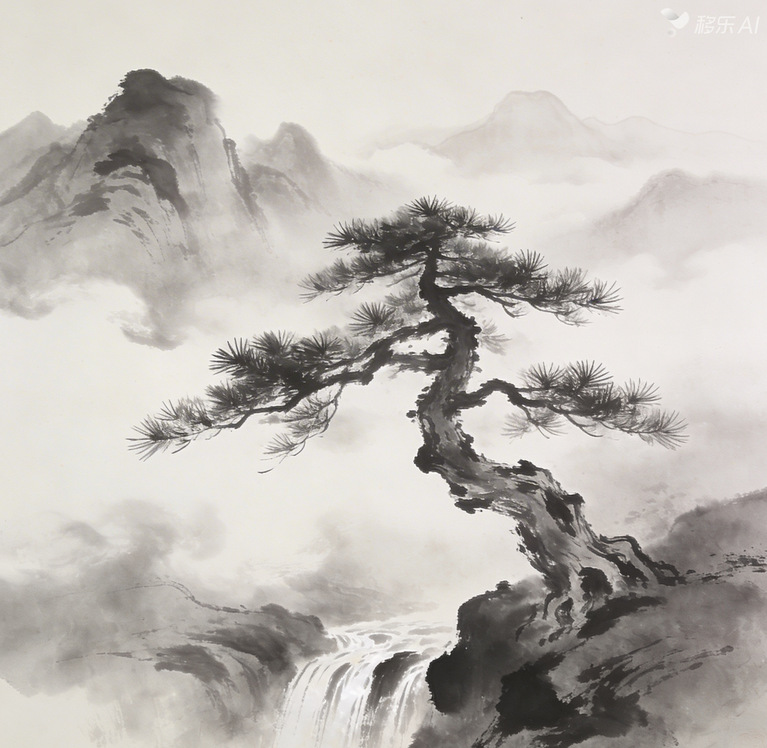完整模板:国风山水画,水墨质感,淡墨色调,留白设计,远山朦胧,云雾缭绕,一棵苍劲松枝,枝干挺拔,下方有潺潺流水,意境悠远,8K高清,无多余元素,适配移乐AI高级生图V4.5;
