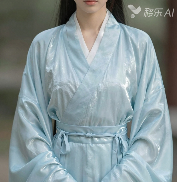 案例示范:古风人像,淡蓝色襦裙,丝绸材质,光滑细腻,光泽感强,垂坠感好,轻微反光,发丝根根清晰,适配移乐AI高级生图V4.5;