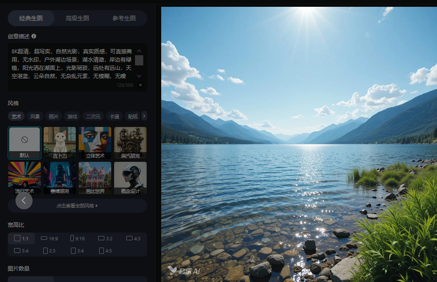 第二步:选择生图模式,设置参数——进入AI生图界面,可选择经典生图、高级生图、参考生图3种模式:经典生图适合快速创作,87种风格模板一键套用;高级生图适合精细创作,4个顶尖模型可按需选择;参考生图适合风格统一,上传参考图就能实现风格迁移;