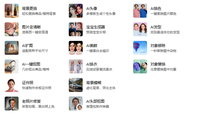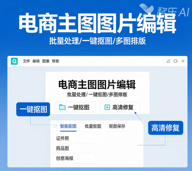 通用模板2(软件类):“电商主图,图片编辑软件,简约科技风,蓝色系背景,软件界面截图清晰,文字标注核心功能(一键抠图、高清修复),商用级高清,排版整洁,无水印,符合京东主图规范”。