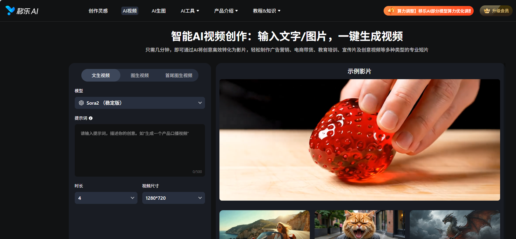 移乐AI视频生成工具已正式接入Sora2模型,在其AI视频版块开放使用。平台同时还支持文生视频、图生视频,以及首尾图生视频三种创作模式。
