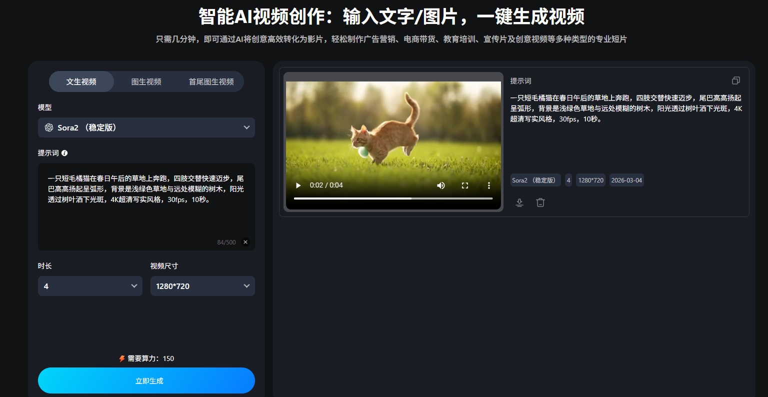 •操作门槛:网页端直接使用,无需下载安装;全中文化操作界面,注册流程简洁;配备清晰操作指引,无专业剪辑基础也能快速上手;精准理解中文提示词,支持一键生成视频,无需复杂操作。