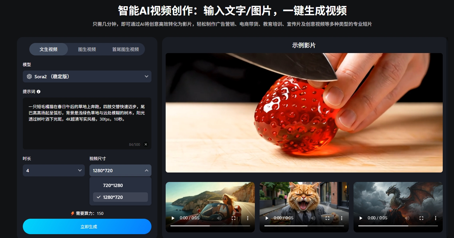 ③ 同时设置视频参数:时长以及视频尺寸。确认参数后,页面将显示所需算力,点击「立即生成」,耐心等待。