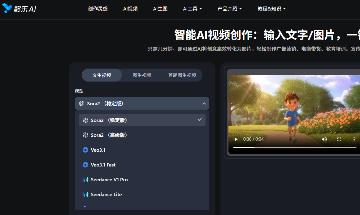 1.登录移乐AI,在首页找到“AI视频”功能入口。点击进入后,你会看到三种模式:“文生视频”、“图生视频”、“首尾图生视频”,选择“文生视频”。在模型选择区域,找到并选中“Sora2(稳定版)”。
