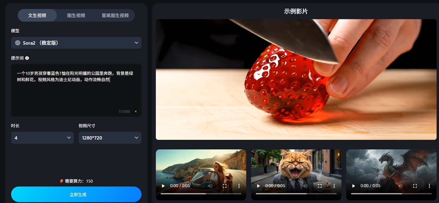 3.输入提示词后,选择合适的视频时长和尺寸,点击“立即生成”。