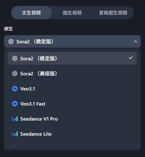模型选择:可选择Sora2或Seedance视频模型。Sora2能还原高速运动下的流体动态与物理破坏感;Seedance则保证人物动作的连贯与张力。