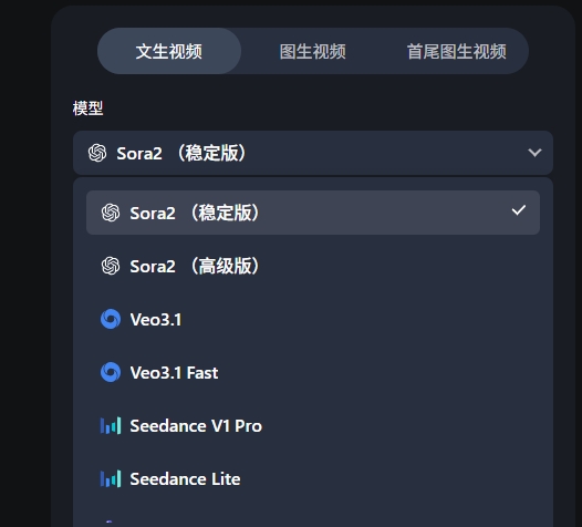 ①打开移乐 AI 官网,点击「AI 视频」,这里你可以看到三种模式,「文生视频」、「图生视频」、「首尾图生视频」,根据创作需求选择合适的模式,并在模型下拉框中选择适配模型(如Sora2稳定版)。