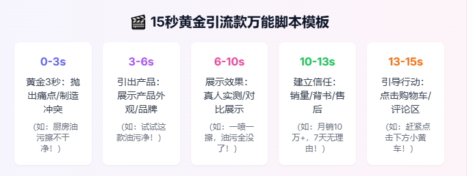 脚本是视频制作的蓝图,遵循“钩子-场景-信任-行动”结构。脚本需包含5个核心要素——时长、画面内容、台词/字幕、背景音乐、镜头角度。