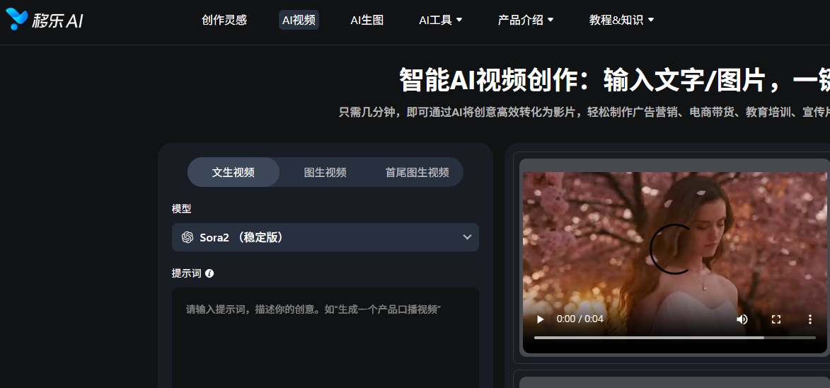 文生视频:根据脚本/文案生成全新素材,适合无基础素材的场景。如移乐AI视频、Sora、Runway Gen-3。