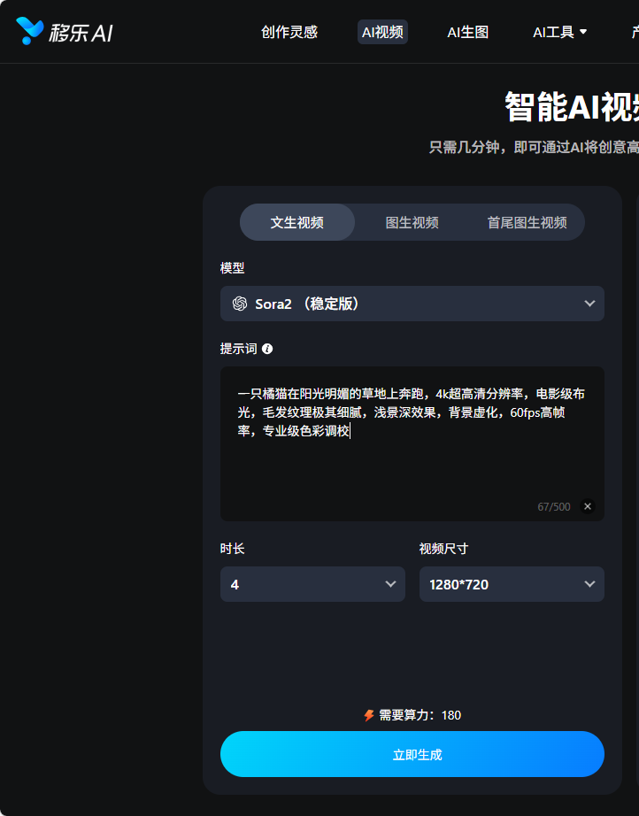 优化后的提示词(画质显著提升):“一只橘猫在阳光明媚的草地上奔跑,4k超高清分辨率,电影级布光,毛发纹理极其细腻,浅景深效果,背景虚化,60fps高帧率,专业级色彩调校”