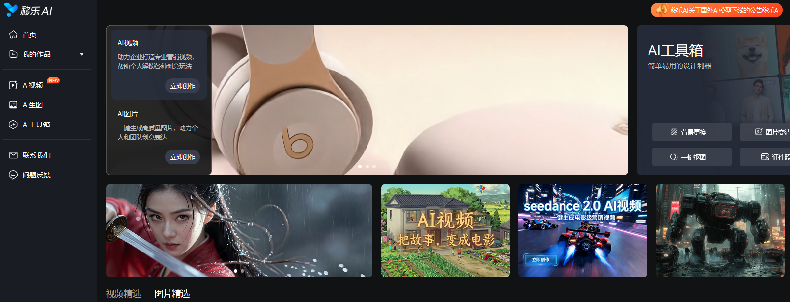 在实测的所有AI视频工具里,移乐AI是唯一一款真正适配国内用户、零门槛上手,还能兼顾专业度和性价比的工具。它聚合了16个国内外顶尖的AI大模型——包括快手的Kling系列、MiniMax的Hailuo系列及轻量高效的Seedance系列等,支持文生视频、图生视频、首尾图生视频三种模式,还整合了从生成到优化的18项核心功能,如“老照片修复”“AI换色”“图片变清晰”等,真正实现一个工具就能满足所有创作需求。