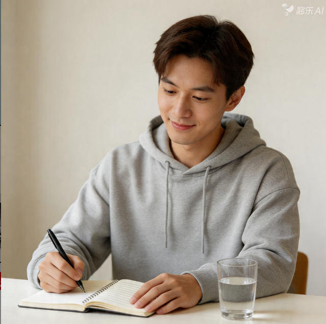 示例Prompt:画面主体是28岁男生,短发,穿休闲卫衣,表情温和,眼神专注,左手拿着笔记本,右手握着笔,轻轻敲击笔记本,嘴角带一丝微笑,情感放松;场景是简约书桌,背景干净;艺术风格是写实风;技术参数是1080P,中景镜头,光线自然,画面稳定。