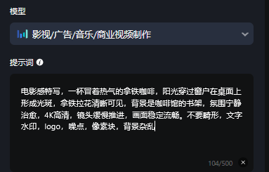 优化技巧:在Prompt中重点补充镜头运镜(如缓慢推进、平稳平移、环绕运镜)、光影细节(如侧光、逆光、光影对比强烈)、电影感描述(如电影级画质、色调浓郁、细节拉满),同时明确主体的质感(如产品的金属质感、衣物的面料质感),让模型重点优化画面质感和氛围。