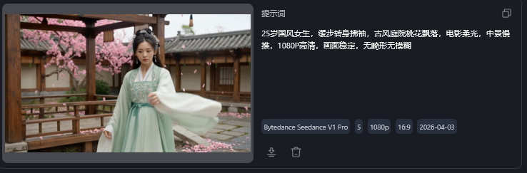 Prompt模板:画面主体是【替换为主体,如:古风女子】,25岁国风女生,缓步转身拂袖,古风庭院桃花飘落,电影柔光,中景慢推,1080P高清,画面稳定,无畸形无模糊。