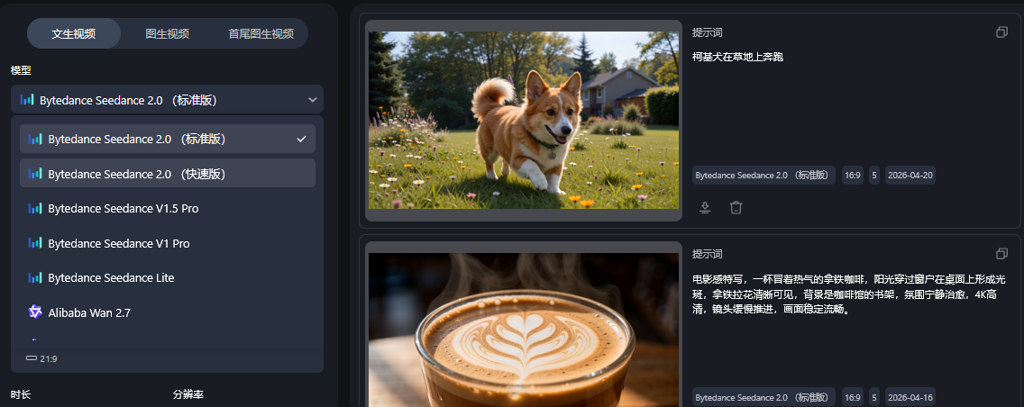 1. 文生视频:拥有18个可用模型,包括字节跳动Seedance 2.0(标准版、快速版)、Seedance V1.5 Pro(电影级专业)、阿里巴巴Wan 2.7(支持真人照片驱动)、Vidu Q3(专为短视频节奏优化)等,覆盖了从追求极致速度、平衡质效,到电影级专业质感的完整需求谱系,不管是做创意段子、影视预告,还是产品演示,都能找到适配的模型。