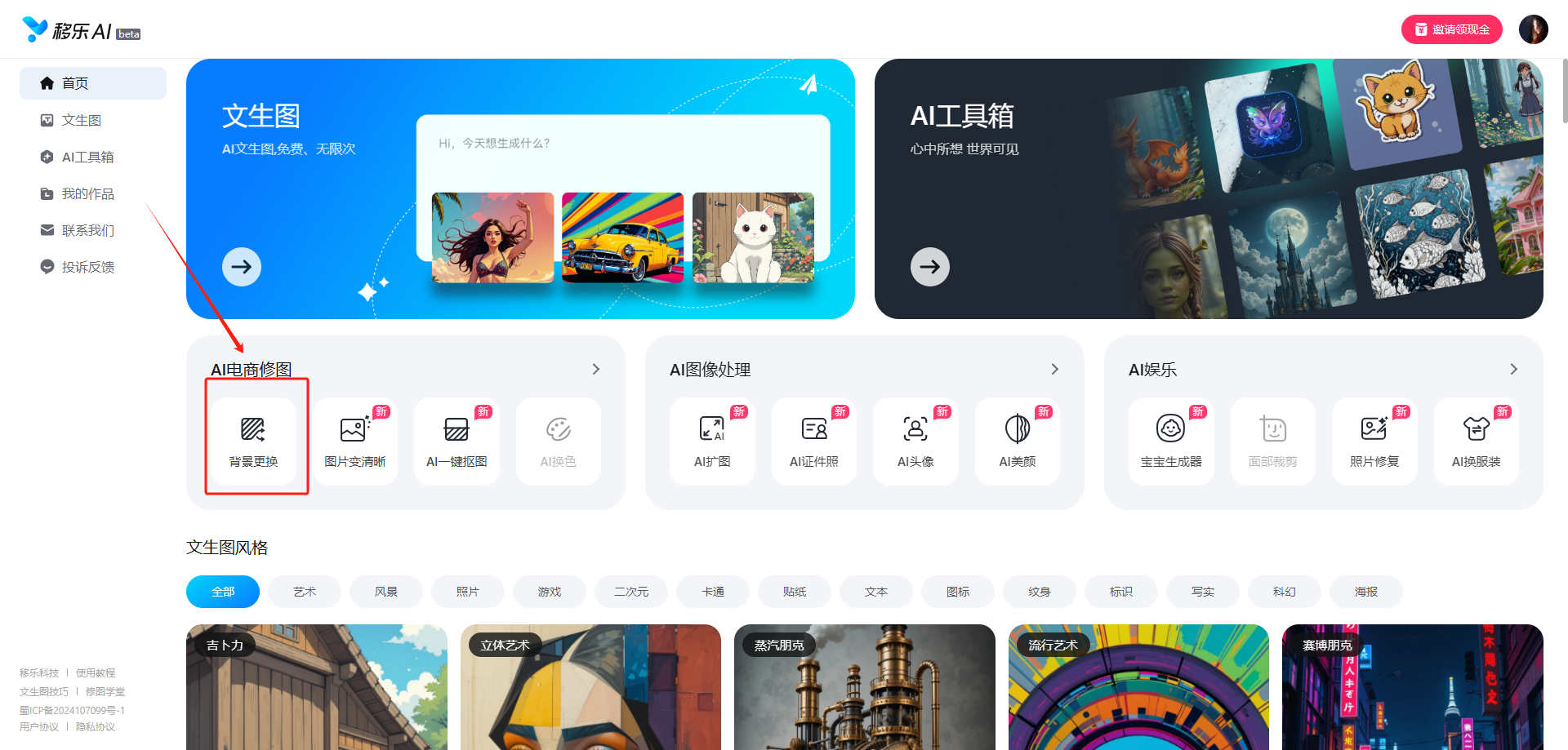 步骤1.网页搜索并进入“移乐AI网站”,在首页找到并打开“背景更换”工具,或直接点击“移乐AI背景更换”进入