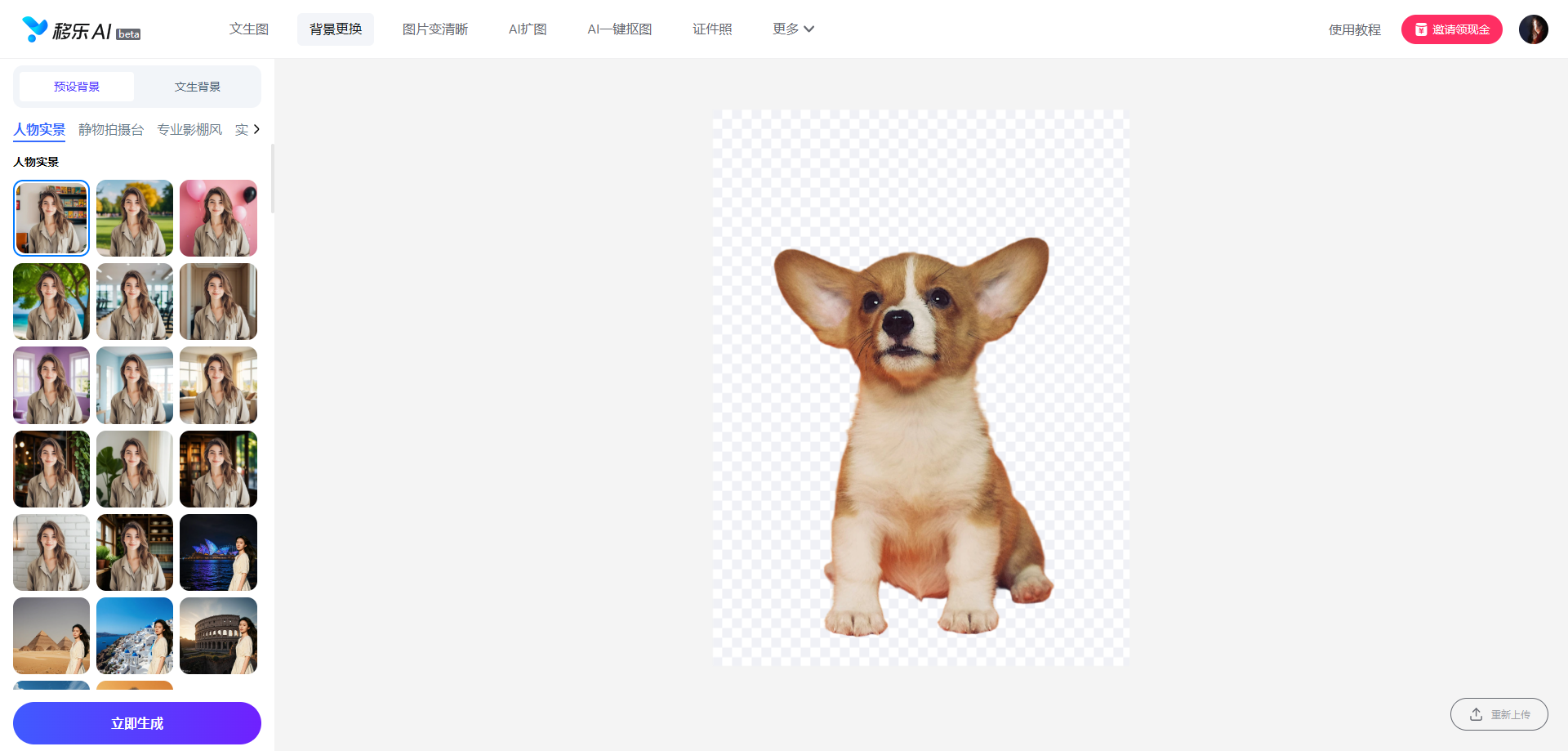 移乐AI背景更换是我最近发现的宝藏工具,它完全解决了我之前用其他工具的痛点。它通过深度学习算法,能精准识别图像中的主体,自动进行背景剔除,并且提供了多个背景模板供用户选择,我们只需上传-换背景-生成图片,30秒就能搞定!重点免费!不用下载APP!下面就来讲讲如何使用它给照片换底色: