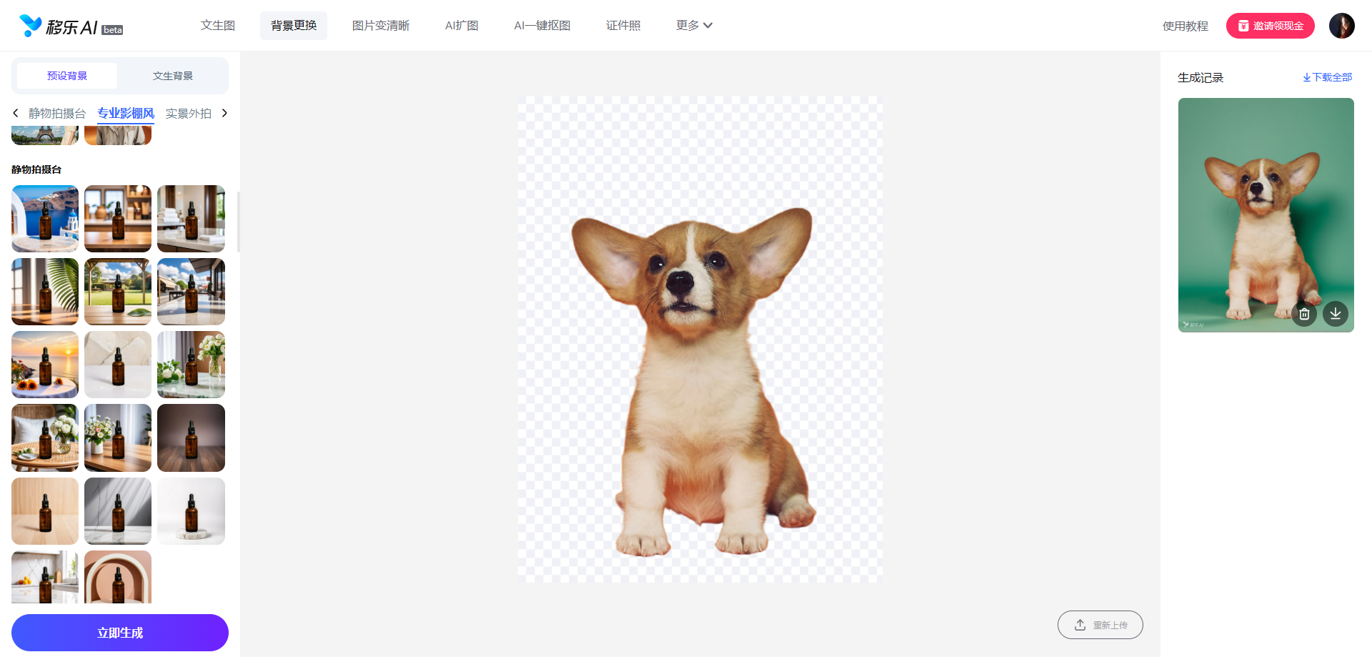 3.立即生成:选择想要的背景,点击“立即生成”,生成后右侧生成记录可以预览效果,支持重新选择背景生成,制作完成后点击下载全部,直接高清导出。