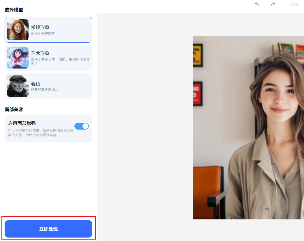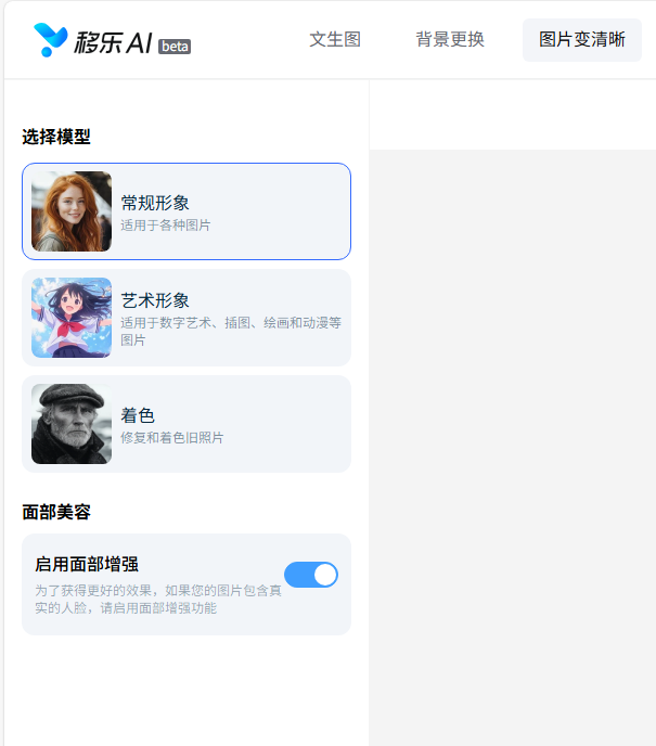 步骤3:根据图片类型选择适合的模型。例如日常生活照可选择“常规形象”,黑白照可选择“着色”。如果图片中包含真实人脸,建议勾选位“面部增强”选项,以获得更好的人像处理效果。