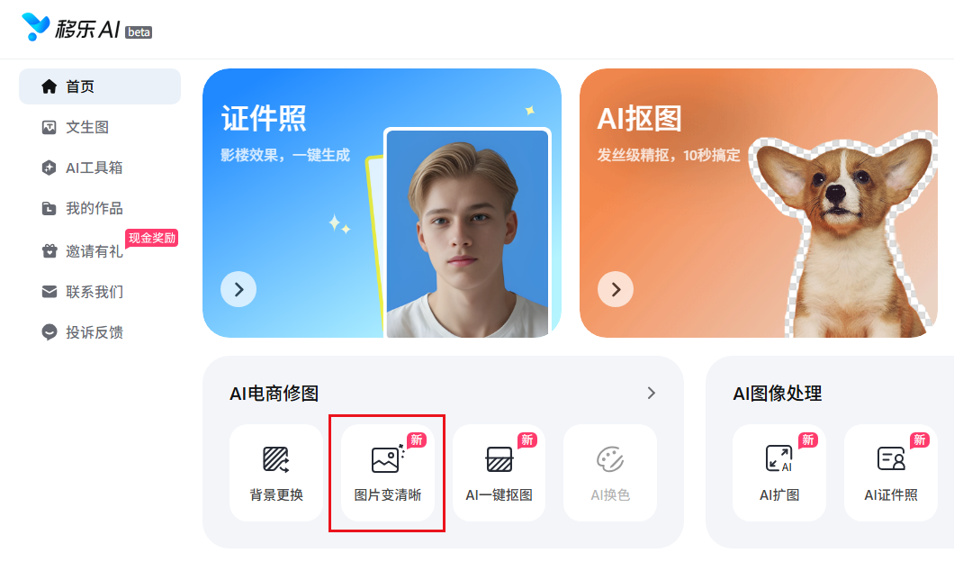 步骤1:浏览器访问移乐AI首页,点击“图片变清晰”功能。