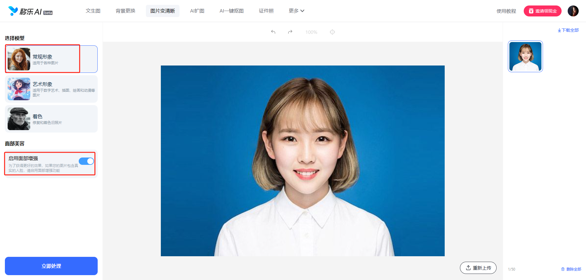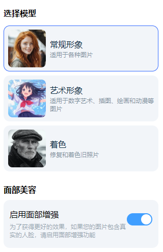 步骤2.选择模型:根据图片类型选择常规形象、艺术形象、着色任意模型,如包含人脸,勾选下方“启用面部增强”选项,AI将自动适配照片修复与人像优化参数。