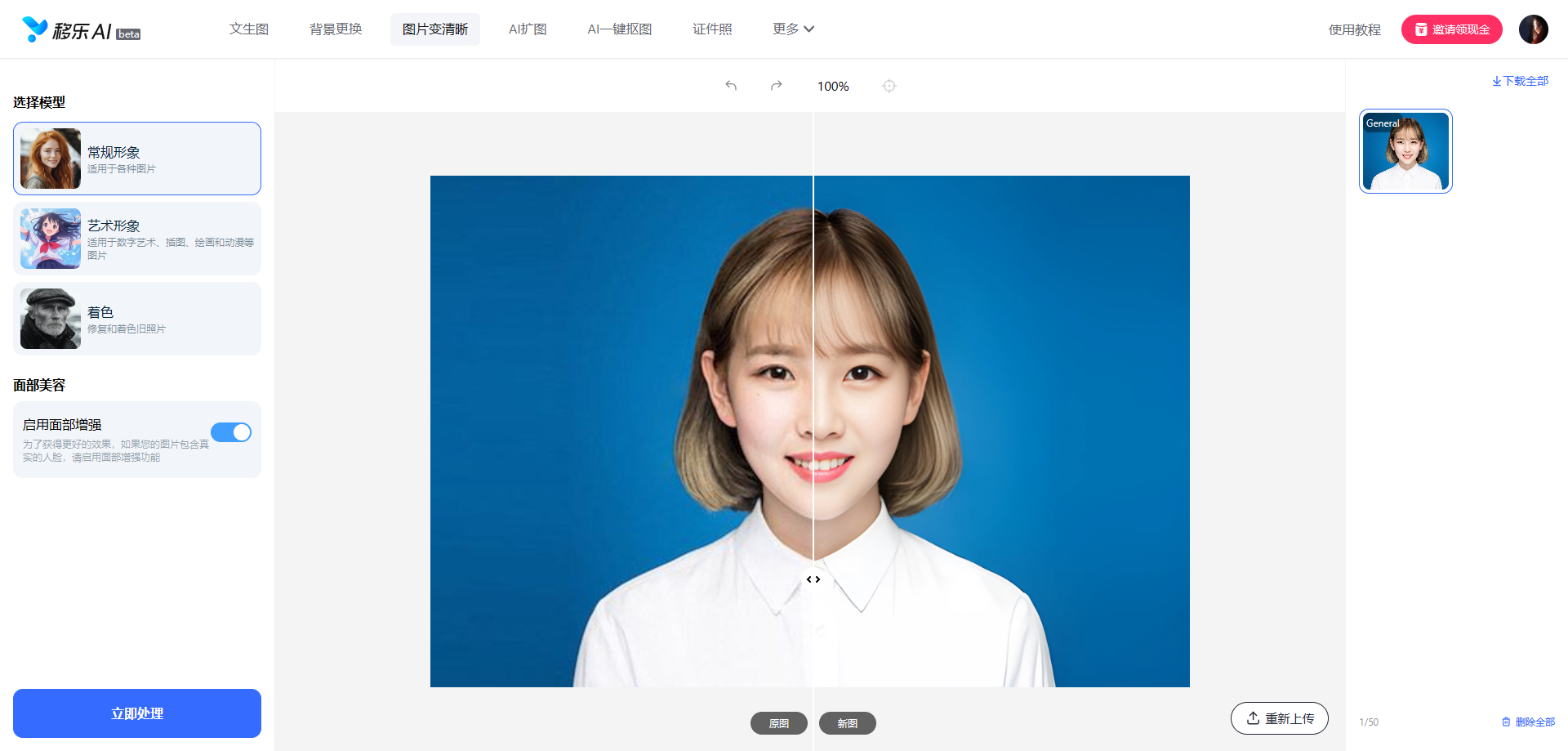 步骤3.生成与下载:点击“立即处理”,等待10秒左右即可预览效果,满意后点击“下载”保存高清无水印图片,若需调整可重新选择模型二次处理。