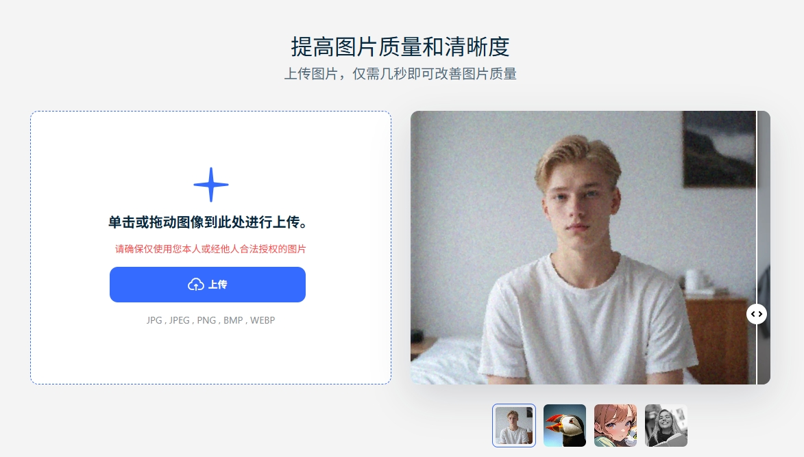 进入移乐AI图片变清晰功能界面,点击上传区域或将图像拖拽至上传区域,选择待优化的图像文件。