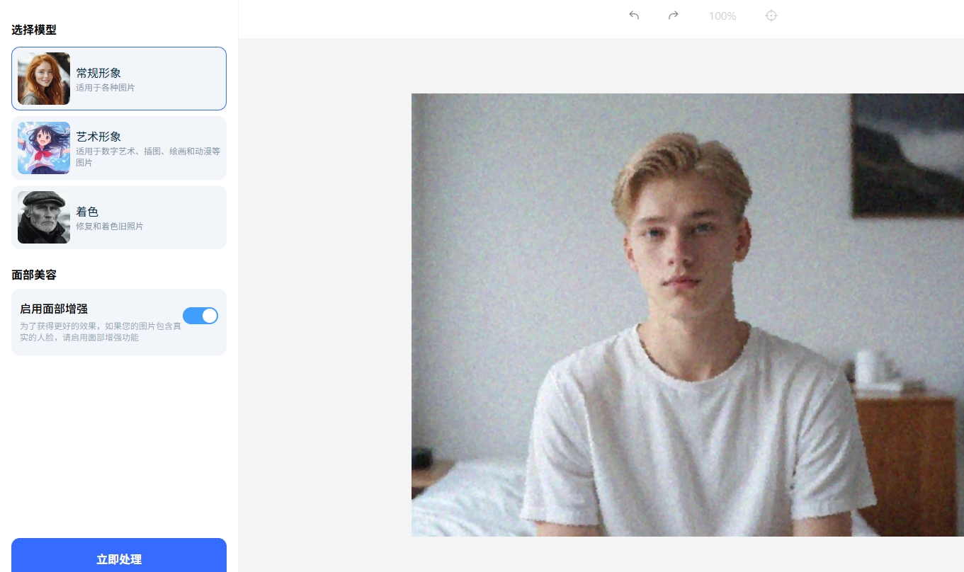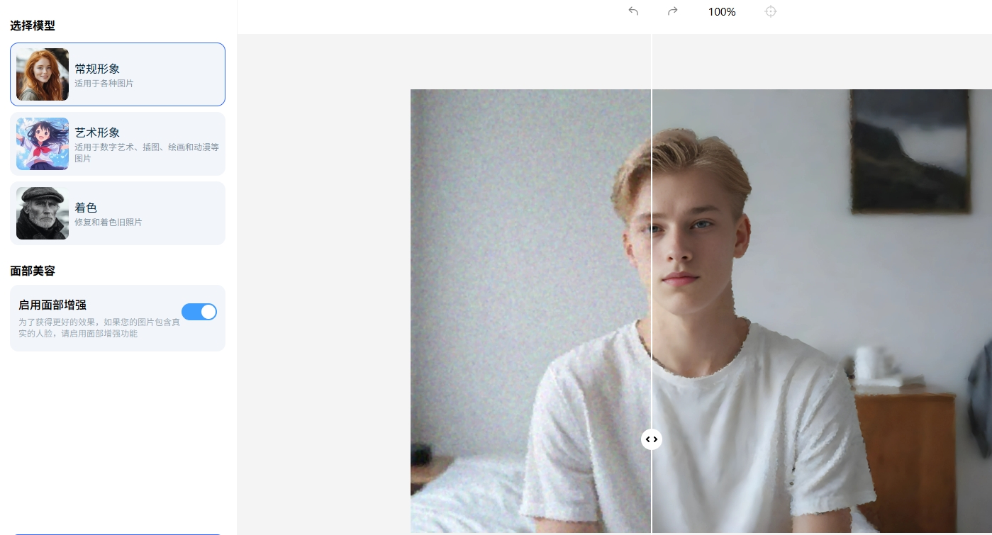 根据你的图片类型以及实际需求,选择模型,例如“常规形象”。如果图片含真实人脸,建议打开「启用面部增强」开关,AI会针对性优化五官细节;要是风景、宠物、艺术图,关着也不影响效果哦~