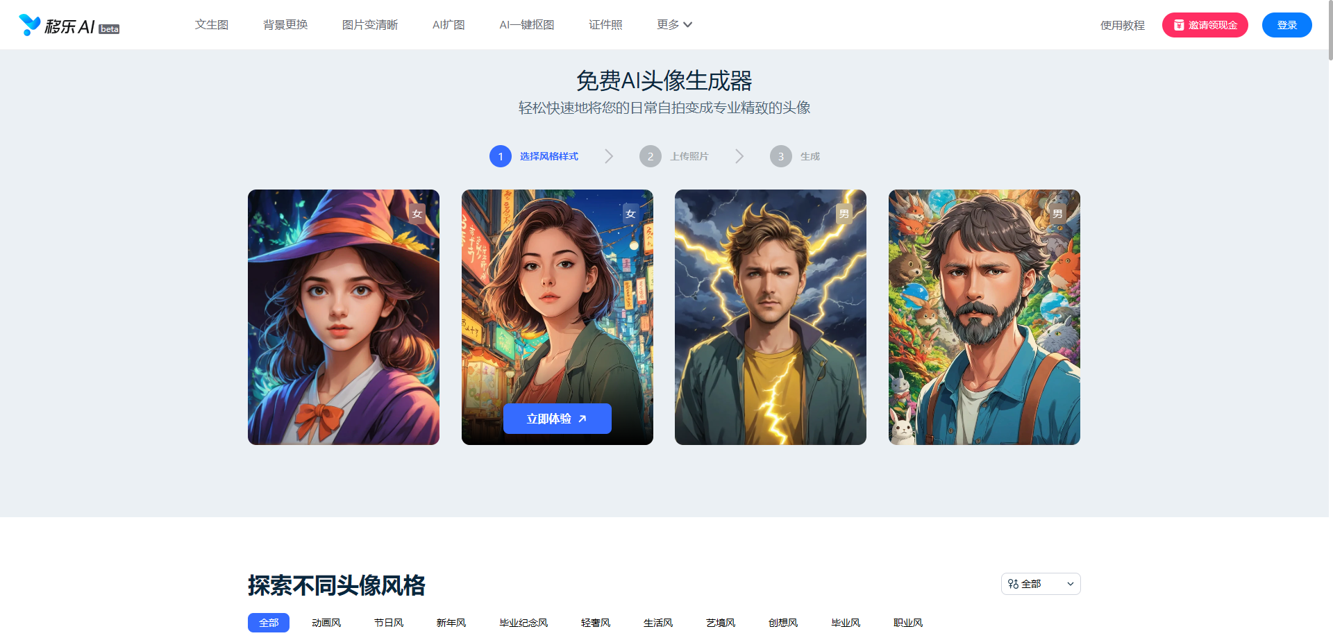 选择想要的头像风格,100+高清模板可以选择,选定后点击“立即体验”进入下一步。