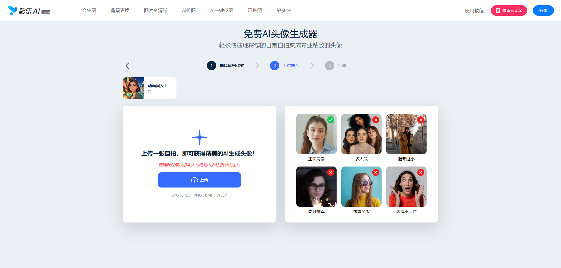 - 点击“上传图片”,选择电脑中的清晰正脸照。建议背景简洁、光线均匀,避免戴帽子、墨镜等遮挡面部,确保五官清晰可见,表情自然。