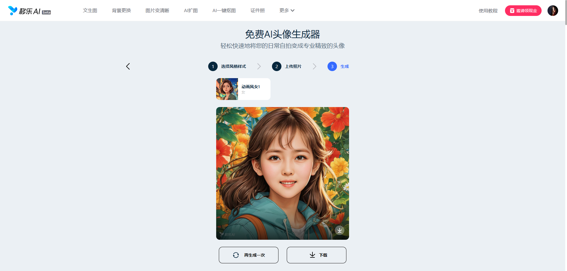 点击“生成”,等待头像制作完成,不满意点“再生成一次”进行重新生成,也可以直接点击“下载”保存生成的高清专属头像照。