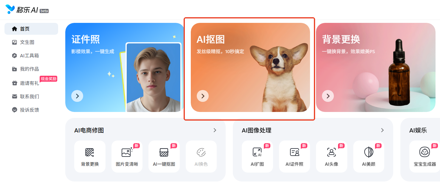步骤1:打开移乐AI官网,在首页找到“AI抠图”入口,点击进入;