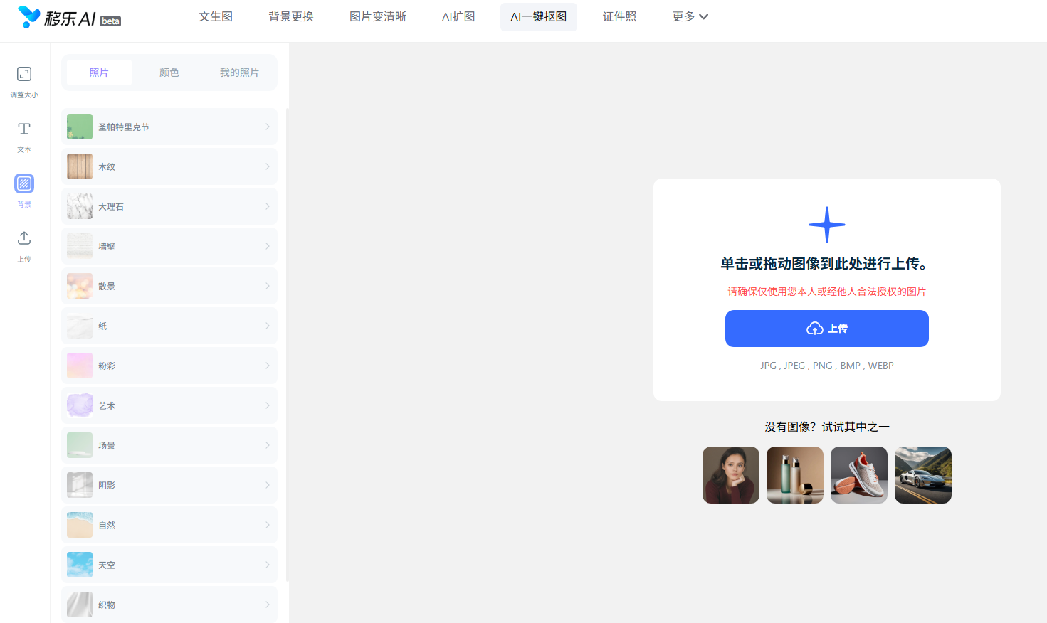 步骤2:点击“上传”,选自己要抠的图(支持JPG、PNG等常见格式),图片上传后等待几秒,AI自动生成透明抠图,这时我们能看到主体和背景已经分开;