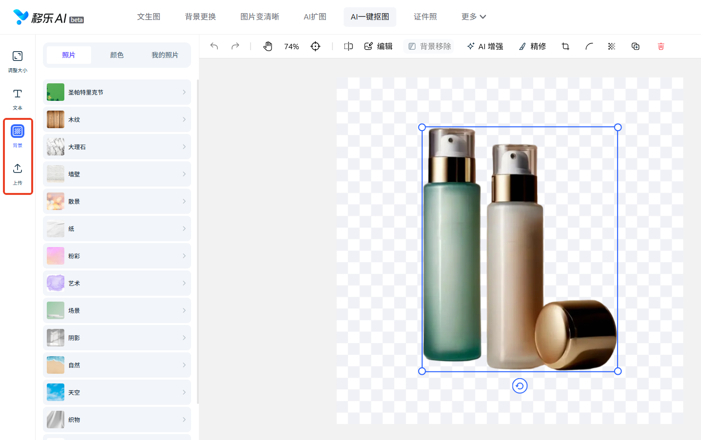 步骤3:这时如果想更换背景,点击右侧“背景”,或者在“上传”的选项中,自己从本地上传背景图片。
