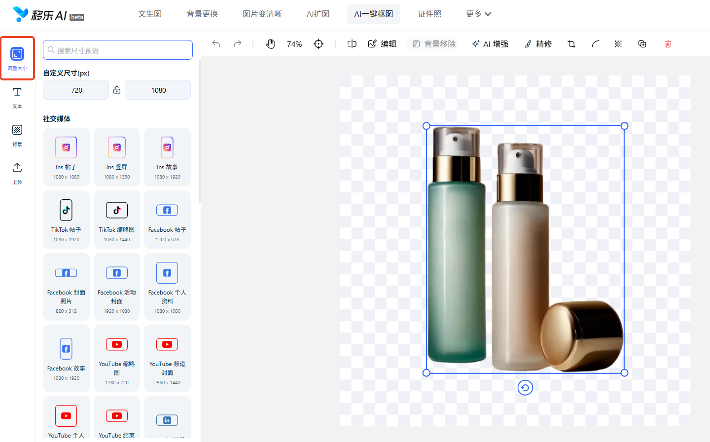 步骤4:如果这时想调整图片尺寸,就点击“调整大小”,自定义尺寸,或者干脆选择工具提供的各大平台的标准尺寸。AI会根据你选择的尺寸大小自动调整图片。