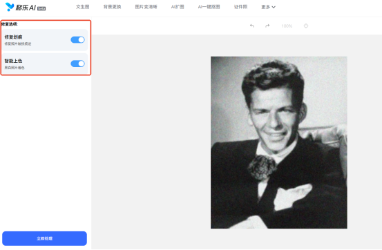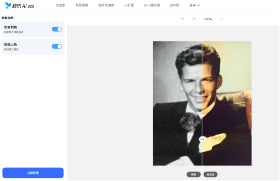 第四步:点击左下角的“立即处理”按钮,AI就会在几秒钟的时间内完成照片修复。修复完成后,你可以通过鼠标拖动分割线来查看修复前和修复后的效果。