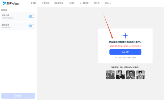 第二步:上传需要修复的照片(点击按钮上传或者拖拽照片上传均可)。
