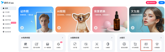 第一步:在你的电脑浏览器中搜索并访问移乐AI官网,在官网首页上找到“照片修复”的功能入口,点击进入。