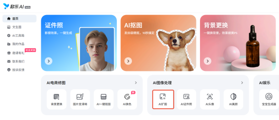 第一步:在浏览器里搜“移乐AI”,进入官网后,在首页找到“AI扩图”功能,点进去。