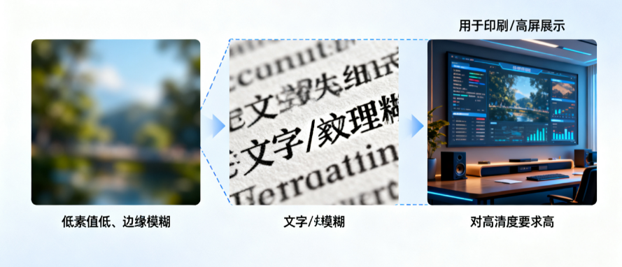 当图片的像素数(长 × 宽)远低于你所需输出场景(如社交媒体封面、大尺寸印刷、展示用图)时,就可能需要高清化处理。比如原图仅为 800 × 600 像素,却要用于印刷或大屏展示,就明显不够。