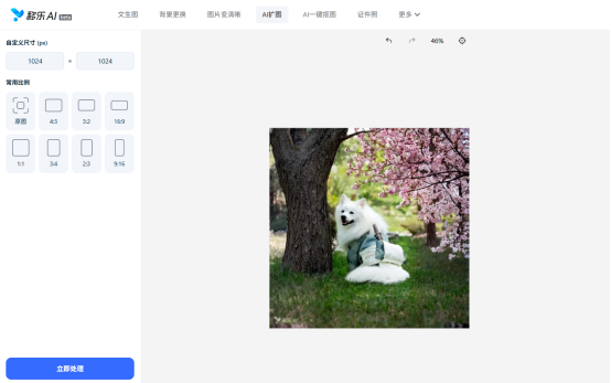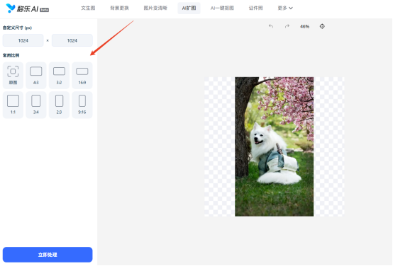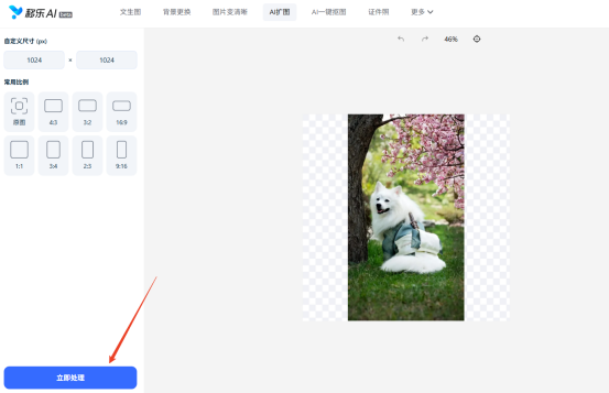 第三步:确认比例无误后,点击“立即处理”按钮。系统将启动AI算法进行智能扩图,请稍候几秒。