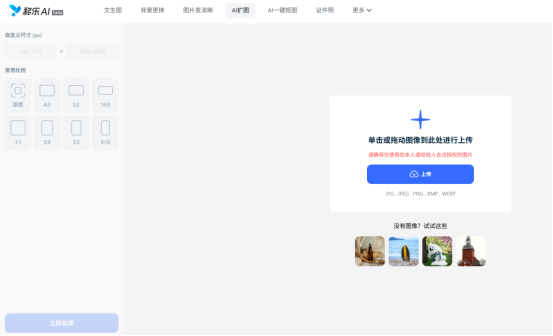 第一步:访问移乐AI官网,点击“AI扩图”进入扩图界面。单击界面中心的“上传”按钮,或直接将电脑中的图片文件拖拽至该区域。